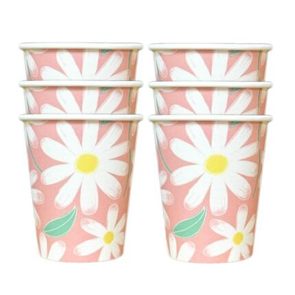 Copos de Papel Margarida – 08 Unidades Cada copo tem capacidade de 240ml, é super resistente podendo ser utilizado com