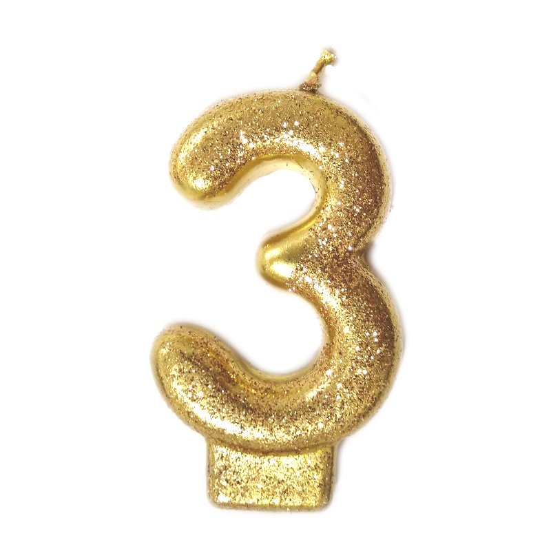 Vela número 3 na cor dourada com glitter com 8cm de altura.