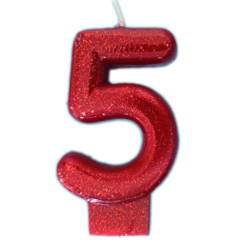 Vela número 5 na cor vermelha com glitter com 8cm de altura.