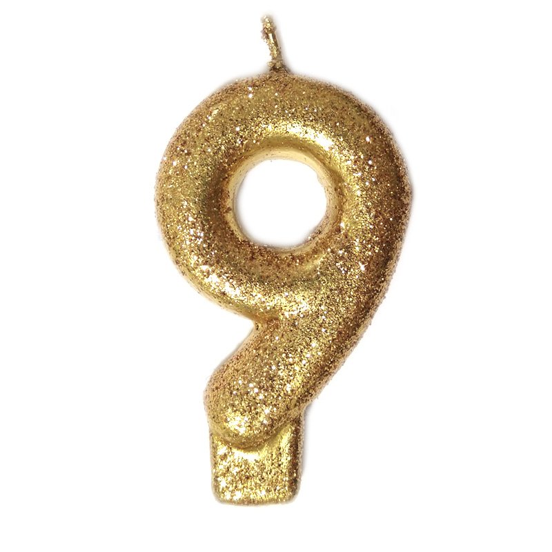 Vela número 9 na cor dourada com glitter com 8cm de altura.